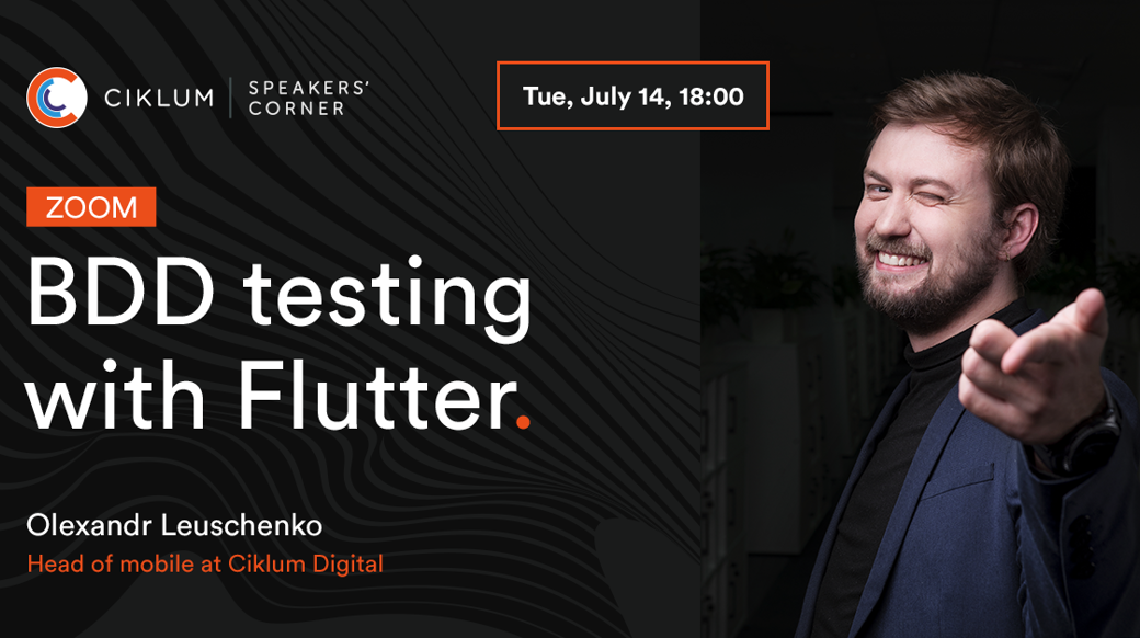 We are very pleased to invite everyone to join our online Speakers ’Corner “BDD testing with Flutter” by Oleksandr Leushchenko, Head of mobile at Ciklum Digital. The event will take place on July 14, at 18.00 via ZOOM. Please fill in the Google form. Zoom link will be sent to your email the day before the event.
