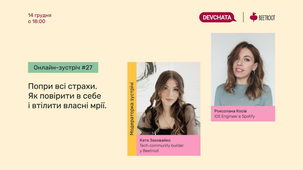 Модеруватиме зустріч Катя Заховайко — співавторка проєкту DEVCHATA, Tech Community Builder у Beetroot, life coach і засновниця Happy Project (happyproject.com.ua).