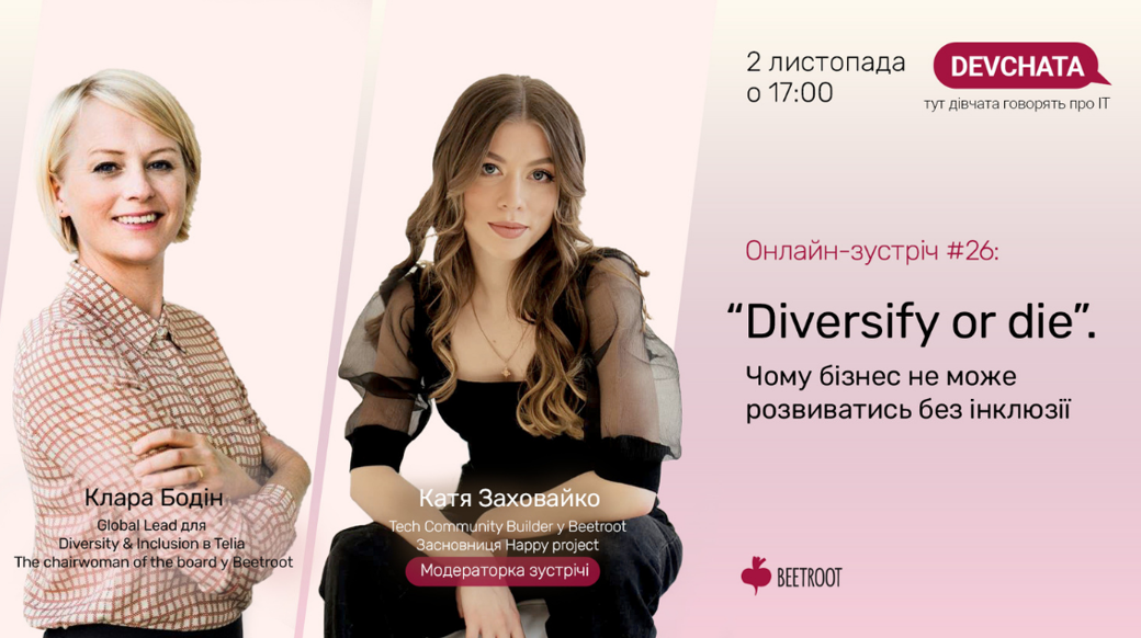 Запрошуємо 2 листопада на чергову зустріч DEVCHATA. Цього разу своїм досвідом ділиться Клара Бодін — експертка і глобальна лідерка з питань дайверсіті та інклюзії. Разом з нею ми поговоримо про: