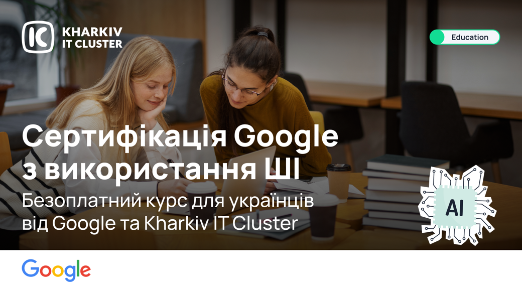 - Безоплатне навчання: доступ до програми «Сертифікація Google із професійного використання ШІ» безоплатний у межах спільної ініціативи Kharkiv IT Cluster та Google.