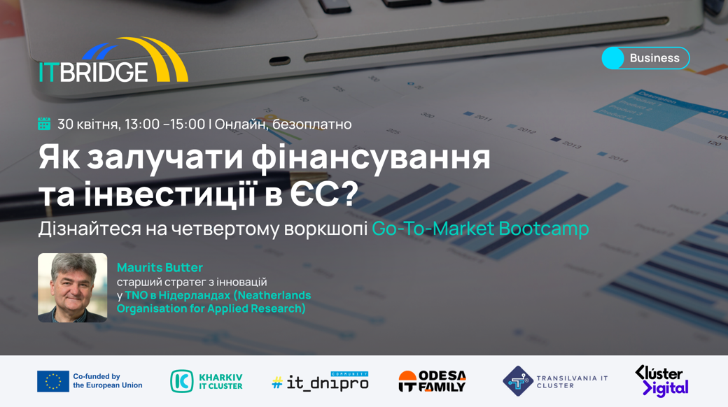 30 квітня відбудеться четвертий воркшоп Go-To-Market Bootcamp у рамках проєкту ITBridge— про те, як орієнтуватися у європейських можливостях фінансування, інвестицій та акселерації і як позиціонувати компанію, щоб реально їх отримати.