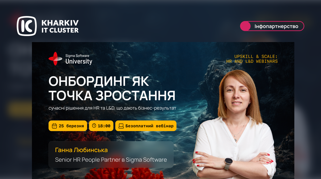 Sigma Software University запрошує долучитися до вебінару для бізнесу «Онбординг як точка зростання: сучасні рішення для HR та L&D, що дають бізнес-результат» про практичні підходи, інструменти та кейси, які застосовуються в масштабній міжнародній ІТ-консалтинговій компанії.