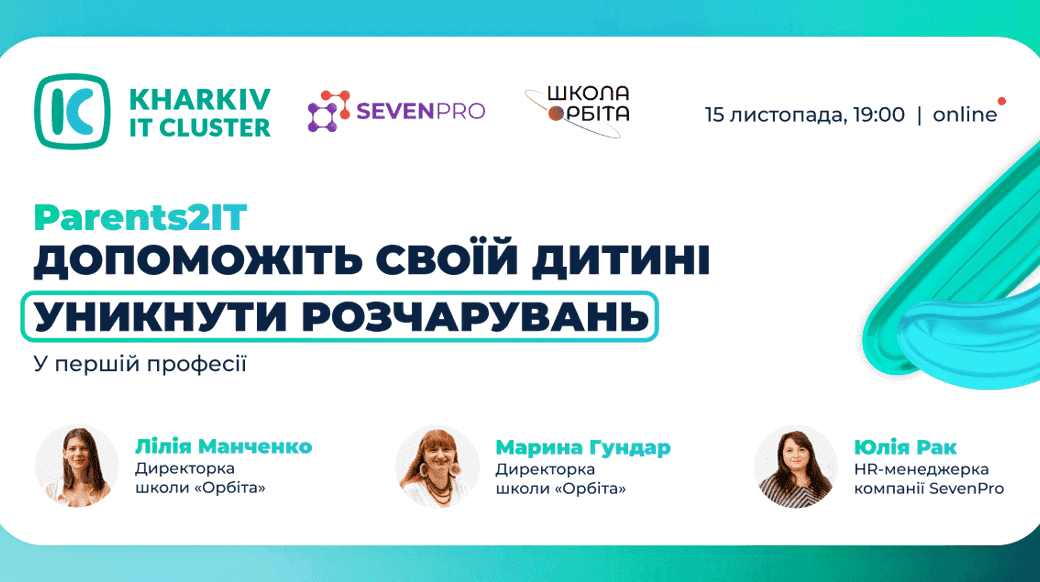 Kharkiv IT Cluster разом із компанією SevenPro й школою «Орбіта» запрошують батьків старшокласників на вебінар Parents2IT, на якому ми розкажемо, як допомогти дитині уникнути розчарувань у першій професії.