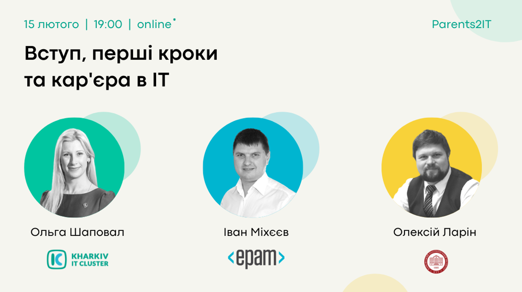 🔹 Ольга Шаповал, виконавча директорка Kharkiv IT Cluster; 🔹 Іван Міхєєв, керівник навчальних програм ЕРАМ на сході України; 🔹 Олексій Ларін, директор навчально-наукового інституту комп'ютерного моделювання, прикладної фізики та математики в НТУ «ХПІ». 🎁 Що отримаєте на зустрічі: краще розуміння сфери, чекліст для абітурієнта з посиланнями на корисні матеріали та унікальні пропозиції від EPAM University і не тільки! Parents2IT — унікальний проєкт для батьків, які хочуть допомогти підліткам зробити свідомий вибір професії! Серед експертів — представники ІТ-компаній та провідних університетів Харкова.15 лютого онлайн-зустріч о 19:00 👉 Зареєструватися на захід 👈