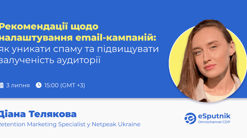 Приєднуйтеся до регулярних вебінарів на маркетингові теми від омніканальної CDP eSputnik 📅3 липня пройде зустріч на тему: Рекомендації щодо налаштування email-кампаній: як уникати спаму та підвищувати залученість аудиторії. Спікерка: Діана Телякова, Retention Marketing Specialist у Netpeak Ukraine. Працює з утриманням клієнтів і конвертацією відвідувачів сайту в лояльних покупців. Допомагає бізнесам запускати та налаштовувати омніканальні комунікації.