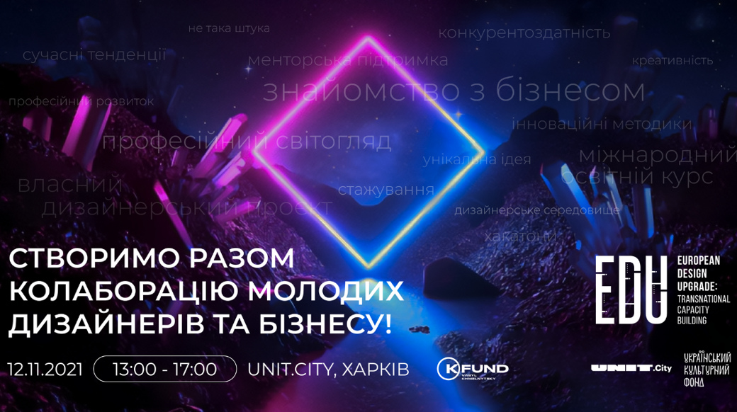 Чекаємо на вас 12.11.2021 в UNIT.City у Харкові, Room 70, о 13:00! Станьте частиною творення креативного майбутнього разом з European Design Upgrade 2.0! Проєкт реалізований у партнерстві фонду K.Fund, громадської організації GoLocal, інноваційно-технологічних хабів Brussels Creative у Бельгії та UNIT.City у Києві та UNIT.City у Харкові. Для участі в події - реєструйтесь за посиланням.
