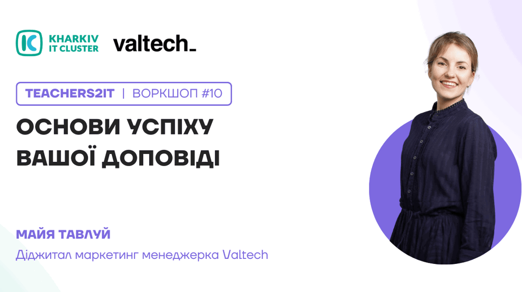 Kharkiv IT Cluster плідно розвинув освітній напрямок у 2022 році. Освітній проєкт Teachers2IT одним із перших відновив свою роботу з початку війни. Саме зараз добігає кінця третій курс Teachers2IT з підвищення кваліфікації вчителів інформатики та математики у 2022 році. 📆 22 грудня Kharkiv IT Cluster запрошує вчителів інформатики та математики на останній Воркшоп №10 у рамках проєкту Teachers2IT! 📢 Спікер Майя Тавлуй — діджитал-маркетинг менеджерка з компанії Valtech, на зустрічі з учителями розбере тему «Основи успіху вашої доповіді» та розкаже про: 💻 види презентацій та їх відмінності; 💻 види цілей у презентаціях; 💻 3 фактори успішної доповіді. 👉А також розкаже чому PowerPoint — не панацея! ⏰ Коли: 22.12 (четвер) о 18:00 📍Де: Online, ZOOM Зустріч проходить за підтримки IT-компанії Valtech. Valtech – міжнародна цифрова агенція з трансформації бізнесу, яка допомагає компаніям бути на крок попереду трендів і взаємодіяти з клієнтами за допомогою цифрових рішень. Valtech – визнаний лідер в світовому рейтингу діджитал агенцій згідно The Forrester Wave: Commerce Services, Q1 2021. Інформацію про попередні воркшопи шукайте в телеграм-каналі для вчителів Teachers2IT: