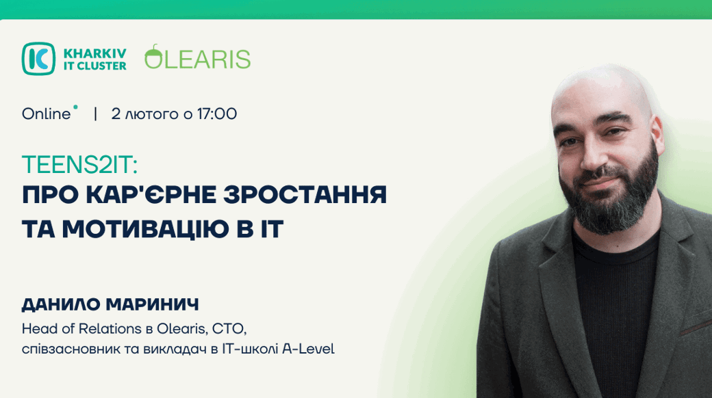 Kharkiv IT Cluster уміє надихати та мотивувати на нові звершення, проте самомотивація — це також дуже важливий soft skill у нашому житті. Що надихає та мотивує команду Харківського ІТ Кластера? Напевно, це люди та прагнення до доброї справи й постійного розвитку!❤️ ⚪️  Мотивація — доволі складний процес,який є рушієм кар’єрного зростання. Kharkiv IT Cluster намагається постійно мотивувати школярів, абітурієнтів та студентів до праці в ІТ. Проте навіть досвідчені айтівці інколи гублять таку потрібну для продуктивної праці мотивацію!  📌  Як же мотивують себе досвідчені айтівці? 📌  Чи є можливість кар’єрного зростання мотивацією для ІТ-спеціалістів? 📌  Як знайти мотивацію в різних ІТ-професіях?  📌 Що потрібно аби пройти шлях від початківця до керівника? Відповідями на ці питання Kharkiv IT Cluster готовий поділитися на першій зустрічі нового сезону Teens2IT! ✅ ☀️ Данило Маринич — Head of Relations в Olearis, CTO, співзасновник та викладач в IT-школі A-Level — розповість усе про кар’єрне зростання й мотивацію  в ІТ-галузі. Протягом свого шляху в ІТ Данило змінив близько 12 ІТ-компаній та спробував себе не в одній ІТ-професії. Наразі Данило займає керівну посаду, і здається нам, знає багато цікавих таємниць.  Маючи величезний досвід, він готовий поділитися ним з тими, хто лише починає свій шлях в ІТ! Долучайся до зустрічі Teens2IT з Данилом і отримай свою порцію мотивації абсолютно безкоштовно! ⭐️ 🔷 Коли? — четвер 02.02, 17:00 🔷 Де? — Online, ZOOM Упевнені, що буде дуже цікаво, тож не барися та скоріше реєструйся! Участь безкоштовна за попередньої реєстрації! 😊 Мотивуйся разом з Kharkiv IT Cluster! 🥰