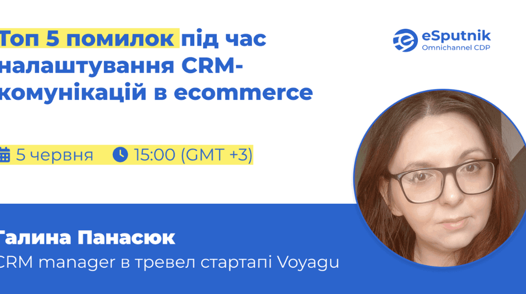 Приєднуйтеся до відкритого вебінару від омніканальної CDP eSputnik на тему – Топ 5 помилок під час налаштування CRM-комунікацій в ecommerce 📅5 червня, 15:00 (GMT +3). Спікерка: Галина Панасюк – CRM manager у тревел-стартапі Voyagu. Має 12 років досвіду в email-маркетингу, ex manager Blablacar, Busfor і Leboutique. Любить перетворювати ідеї в стратегії.