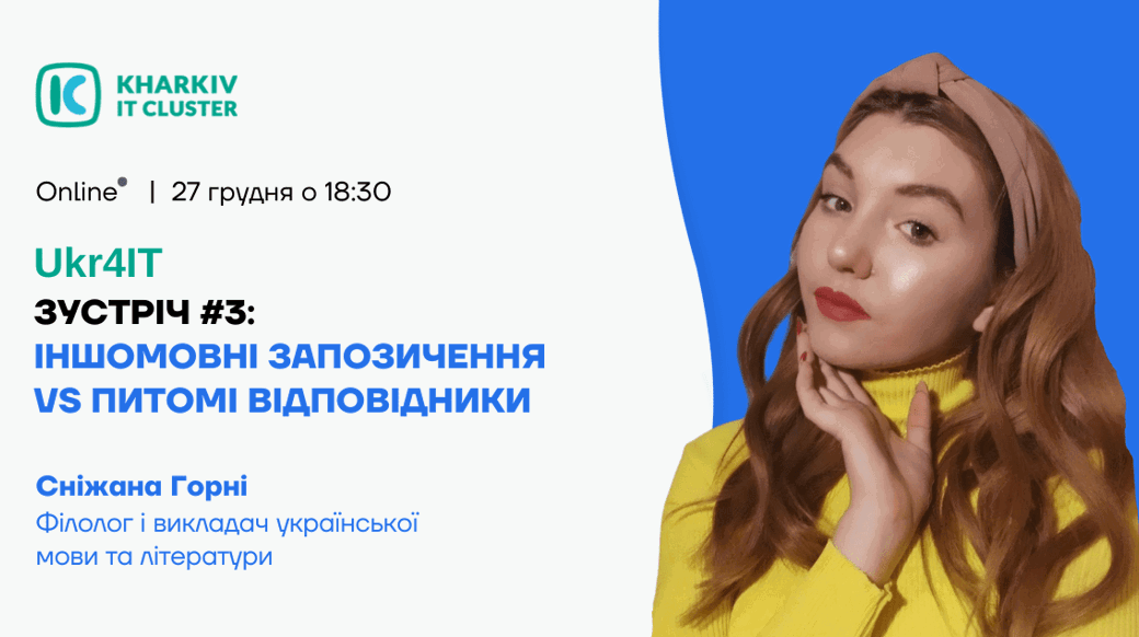 Айтівце, реєструйся на нову зустріч Ukr4IT від Kharkiv IT Cluster, щоб покращити своє мовлення соловїною та дізнатись багато цікавинок! 💙💛