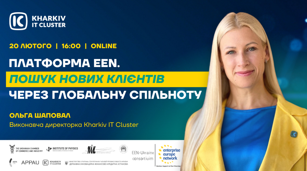 Як шукати міжнародних партнерів? Де знайти іноземних клієнтів? Як відвідувати міжнародні заходи? На ці та інші хвилюючі питання ви можете отримати відповідь 20 лютого о 16:00, на першому вебінарі "Платформа EEN. Пошук нових клієнтів через глобальну спільноту" 🌐 Зверніть увагу, що ця платформа дозволяє шукати партнерів не тільки на європейському ринку, але й по всьому світу (Америка, Європа, Азія). Cпікер івенту: Ольга Шаповал, виконавча директорка у Kharkiv IT Cluster. На зустрічі ми розкажемо: ✅ Що таке EEN. ✅ Успішні кейси співпраці на європейській платформі. ✅ Міжнародні можливості для мемберів Kharkiv IT Cluster. ✅ Як користуватися системою. В режимі live розберемося в основних функціях платформи. ✅ Як доєднатись до платформи EEN. До зустрічі у Zoom 😉 Посилання на зустріч шукайте на внутрішніх каналах Kharkiv IT Cluster.