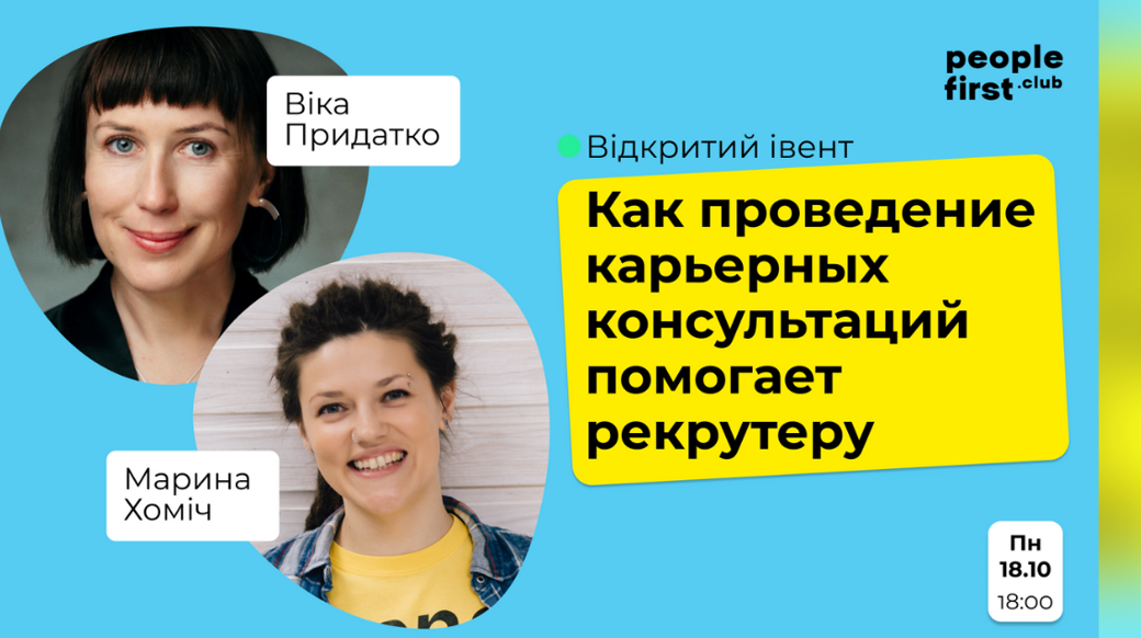 «Як проведення кар’єрних консультацій допомагає рекрутеру» — безкоштовний відкритий івент з Вікою Придатко та Мариною Хоміч з VP Team. Івент буде корисний рекрутерам з будь-яким рівнем досвіду, наймаючим менеджерам і всім, хто займається пошуком кандидатів та проведенням інтерв'ю.