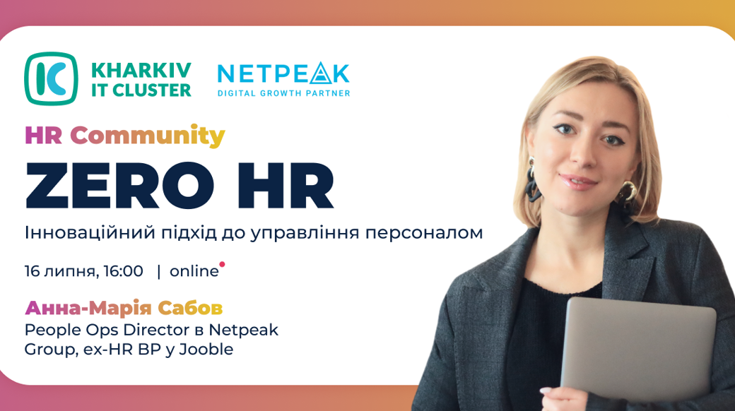 🎙 Анна-Марія Сабов — People Ops Director в Netpeak Group, еx-HR BP у Jooble. 💰 Вартість участі — 490 грн. Зібрані гроші ми спрямуємо на перезапуск технічної освіти. Мембери Kharkiv IT Cluster мають знижку 100%, учасники IT Cluster in the Cloud — 15%. Ти не учасник Kharkiv IT Cluster? Завантажуй застосунок IT Community — отримай безкоштовний квиток на івент! Їх лише 5, тож поспішай! Приєднуйся до події — управляй не ресурсами, а середовищем. Квиток — за посиланням.Вебінар від Kharkiv IT Cluster «Zero HR: інноваційний підхід до управління персоналом»
