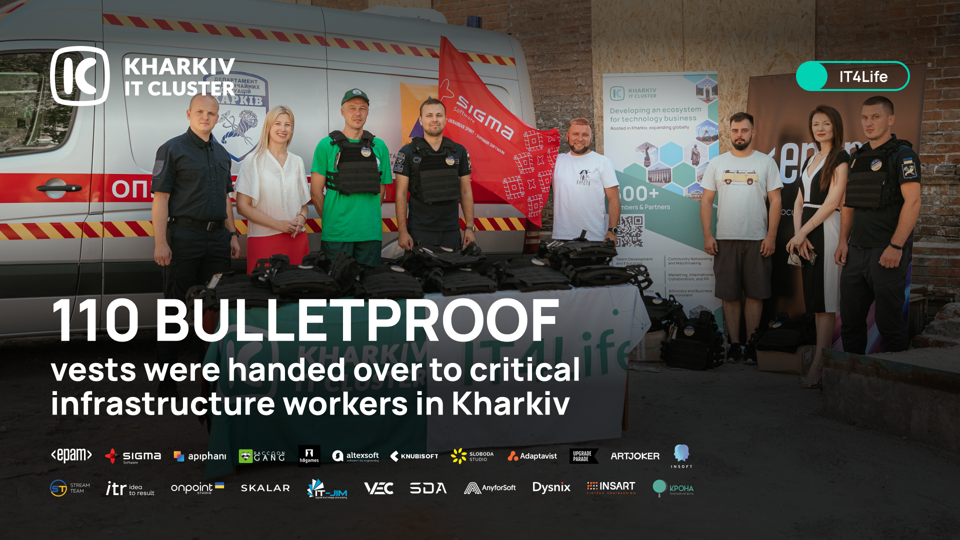 As part of the IT4Life project, Kharkiv IT Cluster has delivered 110 body armors of protection classes 3 and 4 to the municipal services of Kharkiv — including emergency and rescue workers. This initiative is a direct response to a request from public utility companies seeking protection for their employees.