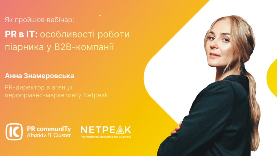 Гора досвіду в маркетингу: організація власних івентів агенції, робота зі ЗМІ, публікації експертних статей та багато інших активностей. Це все про нашу спікерку Анну Знамеровську! Піарниця агенції перфоманс-маркетингу Netpeak, Анна вже 7 років у PR, 4 з яких успішно розвиває бренд агенції Netpeak. Попри те, що подія розрахована на спеціалістів із ІТ-сфери, серед охочих послухати Анну Знамеровську були представники й інших галузей, зокрема, телебачення.На захід зареєструвалось понад 110 осіб. Частина з них мала можливість подивитися зустріч у записі за особистим посиланням. Тема зустрічі — PR в IT: особливості роботи піарника у B2B-компанії.Як починала свою кар'єру в PR