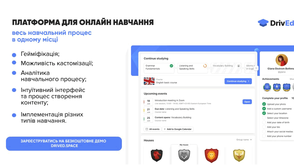 DrivEd - це не просто платформа для навчання, але і інструмент для стратегічного управління освітнім бізнесом. З найновітнішими інструментами DrivEd, освіта стає не лише ефективною, але й інноваційною. Запрошуємо вас на демо онлайн платформи для навчання DrivEd! Переконайтеся, як ця платформа зробить ваш освітній процес результативним. Натискайте на кнопку “Get Started”' на сайті https://drived.space/ та відкрийте новий вимір навчання!Підпишись на наш телеграм канал, щоб бути у курсі подій