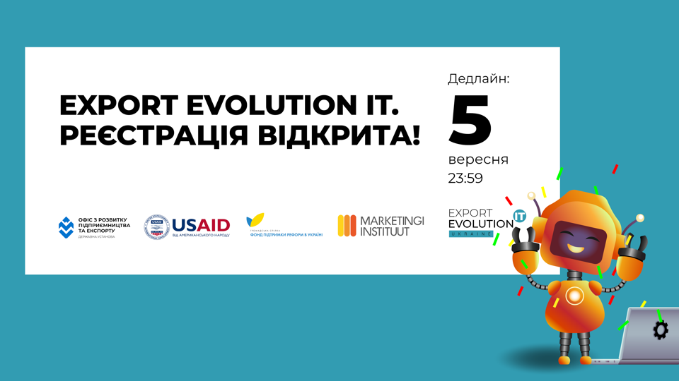 Презентація програми вже 26 серпня, з 11:00 до 14:00 під час онлайн заходу IT DAY: експертної панельної дискусії “Експорт в ІТ секторі: можливості, виклики та як ефективно розвивати бізнес”. Під час заходу буде проведено лотерею з можливістю виграти бонус — консультацію від ментора Програми (1 годину) та бізнес-книги. Export Evolution IT Program розроблена Фондом підтримки реформ в Україні, Інститутом маркетингу (Естонія) та Офісом з розвитку підприємництва та експорту за підтримки Програми USAID «Конкурентоспроможна економіка України». *** Фонд підтримки реформ в Україні — незалежна неурядова громадська організація, яка здійснює свою діяльність з січня 2015 року з метою сприяння розвитку України та зростанню благополуччя її громадян шляхом надання підтримки у розробці та впровадженні реформ в Україні. Офіс з розвитку підприємництва та експорту — державна установа, утворена з метою підтримки та просування експорту товарів, робіт та послуг українських виробників, а також участі в реалізації Експортної стратегії України. Інститут маркетингу (Естонія) — естонська компанія, яка спеціалізується на навчанні та консультаціях з питань експорту, маркетингу та підприємництва. Експертиза компанії полягає у використанні інноваційних методів навчання, що поєднують онлайн та офлайн навчання, створення мереж, наставництво, коучинг, консультації та гейміфікацію, щоб знайти найкращі способи навчання та підтримати запровадження навчання у повсякденну практику компаній. Програма USAID «Конкурентоспроможна економіка України» (Програма USAID КЕУ) підтримує стартапи й малі та середні підприємства (МСП) з метою підвищення їхньої конкурентоспроможності на внутрішньому ринку України та на міжнародних ринках, допомагає в розбудові спрощеного та прозорого бізнес-клімату, а також забезпечує українські компанії можливостями скористатись перевагами міжнародної торгівлі.Підпишись на наш телеграм канал, щоб бути у курсі подій