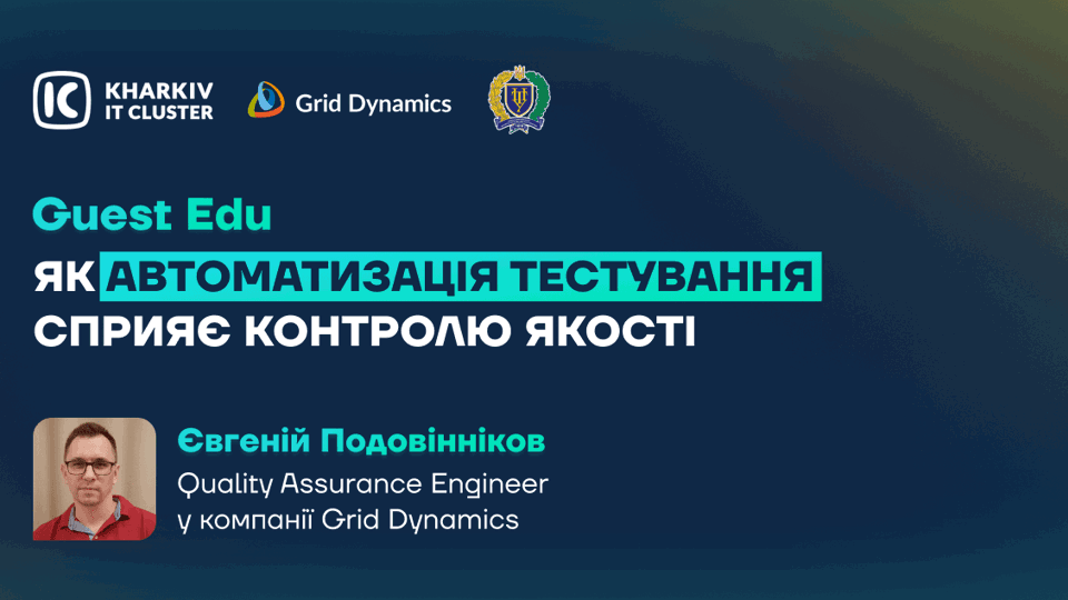Kharkiv IT Cluster дякує Євгенію Подовіннікову, Quality Assurance Engineer у компанії Grid Dynamics, за надану можливість студентам розібратися з різними аспектами контролю якості, включаючи виявлення та виправлення помилок, перевірку коректності функцій та забезпечення надійності та стабільності продукту. Спікер також наголосив на важливості високої якості продукту для досягнення успіху в конкурентному ринку програмного забезпечення. Під час лекції були наведені приклади реальних випадків багів. Довідка: Grid Dynamics — це технологічна компанія, яка спеціалізується на розробці програмного забезпечення та наданні послуг цифрової трансформації бізнесу. Grid Dynamics працює з такими галузями, як фінанси, роздрібна торгівля, телекомунікації, технології та електронна комерція, допомагаючи своїм клієнтам швидко впроваджувати технологічні рішення та збільшувати прибуток.Підпишись на наш телеграм канал, щоб бути у курсі вступної кампанії 2023