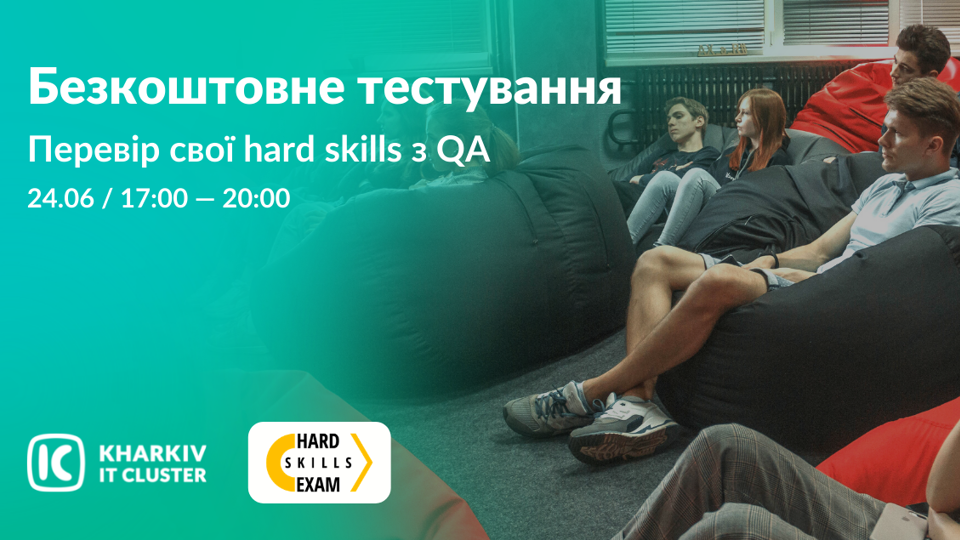 Приходь до Наукового парку «Синергія» 24 червня та проходь тестування Hard Skills Exam за напрямом QA від Kharkiv IT Cluster! Hard Skills Exam — це безкоштовна можливість студентам IT-курсів пройти технічний тест, узгоджений із великими IT-компаніями Харкова, і перевірити рівень своїх знань. Детальніше про Hard Skills Exam Після проходження тесту ІТ-компанії Kharkiv IT Cluster також будуть зацікавлені в кандидатах, які отримають найкращі результати. Поспішай! Кількість місць обмежено!Реєстрація на тестування обов’язкова та триватиме до 21 червня