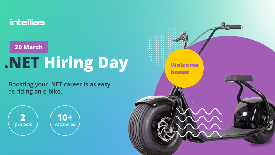 Будувати .NET кар'єру з Intellias так просто, як розсікати на електроскутері. Приймай офер на .NET Hiring Day та отримай потужний електробайк Like.Bike SEEV у подарунок. Приєднуйся до #Intellias та насолоджуйся стрімкою кар’єрою, яку ми тобі запропонуємо, до речі, є вакансії remote!