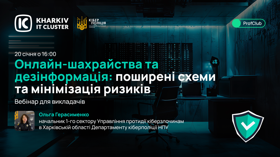 Kharkiv IT Cluster запрошує викладачів, управлінців та всіх зацікавлених на практичний вебінар, присвячений протидії онлайн-шахрайству та дезінформації.