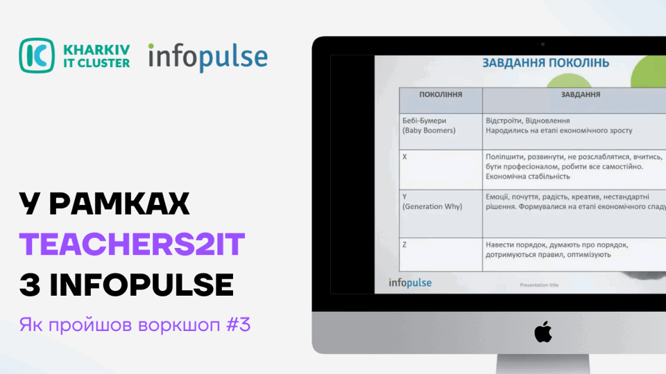 Учасники залишилися у захваті від вебінару та від того, як Лалі ґрунтовно розкрила питання поколінь: «Я вважала, що Y-покоління навмисно маніпулює, але, виявляється, вони справді такими є…. Дякую за інформацію, дуже цікаво!», — коментує у Zoom Наталя. «Дуже цікаво, буду використовувати Ваш матеріал про покоління, Лалі, для спілкування з керівництвом», — пише в Zoom Олена. Kharkiv IT Cluster вдячний Лалі та компанії Infopulse за те, що поділилися корисною та цікавою інформацією із учасниками проєкту Teachers2IT! 👉 Інформацію про початок четвертого воркшопу шукайте в телеграм-каналі для вчителів Teachers2ITТакож читай новини на наших сторінках в соціальних мережах: