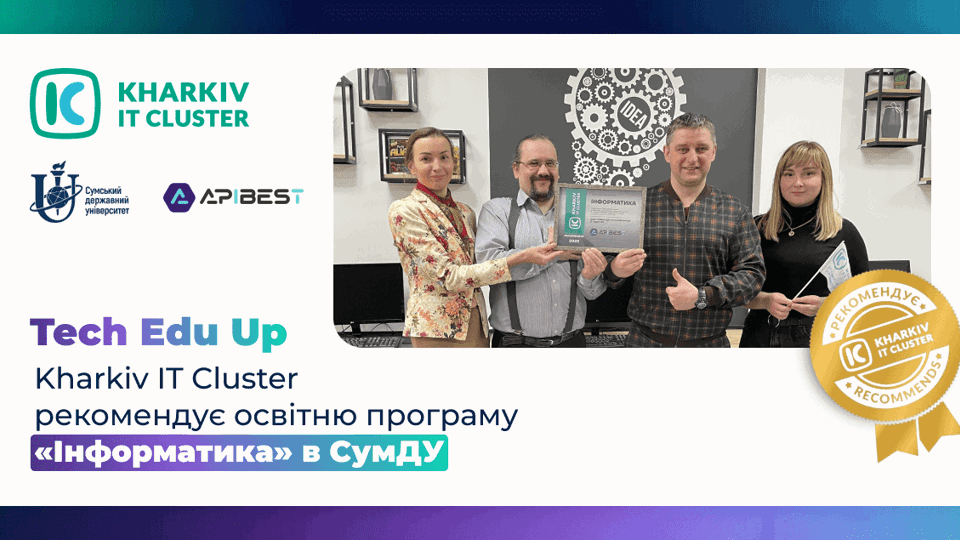 Харківський IT Кластер та ІТ-компанія APIBEST у межах проєкту Tech Edu Up! переглянули на відповідність вимогам ринку праці в IT-галузі освітньо-професійну програму «Інформатика» спеціальності 122 «Комп’ютерні науки», за якою навчають майбутніх ІТ-фахівців на факультеті електроніки та інформаційних технологій в Сумському державному університеті. За результатами розгляду освітньо-професійної програми «Інформатика», керівник освітнього напрямку Харківського ІТ Кластера Олена Лоєнко відвідала Сумський державний університет та вручила відзнаку від Харківського ІТ Кластера, що підтверджує відповідність освітньої програми вимогам бізнесу.У межах покращення дисциплін, експертами рекомендовано додатково ввести дисципліну з комп’ютерних мереж і хмарних обчислень для програми підготовки бакалаврів.