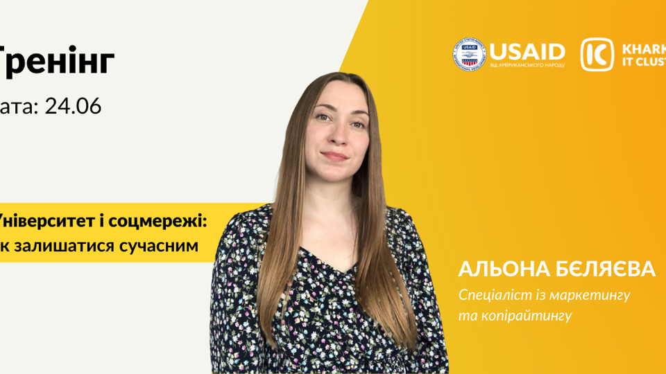 Дізнайтеся про лайфхаки промоції університетів! 24 червня о 13:00 Kharkiv IT Cluster проведе вебінар на тему «Університет і соцмережі: як залишатися сучасним». Альона Бєляєва, фахівець із маркетингу та копірайтингу, розкаже про тренди текстів 2021 року, секрети написання публікацій, які хочеться читати, а також про сильні ліди. Вебінар стане в пригоді спеціалістам, які відповідають за промо-кампанії в університетах Харкова. Ви розглянете теоретичну частину та закріпите нові знання на практиці!