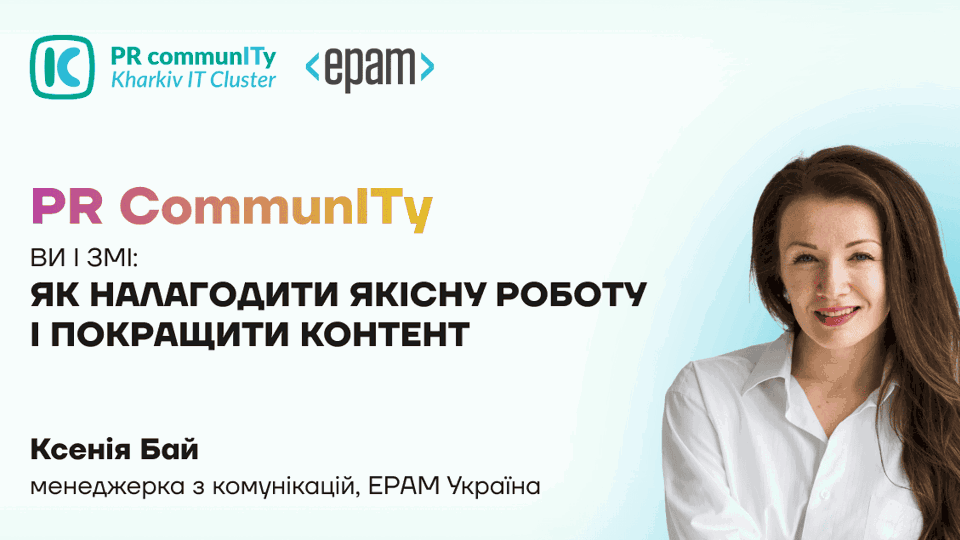 Сьогодні PR-спеціалісти, журналісти та всі зацікавлені в медіаконтенту зібралися на заході PR Community, який провів Kharkiv IT Cluster. Тема заходу була дуже важливою: «Ви та ЗМІ: як налагодити якісну роботу і покращити контент». Головним спікером заходу стала Ксенія Бай — досвідчена менеджерка з комунікацій в компанії ЕРАМ з більш ніж 12-річним стажем. Вона допомагає експертам з різних галузей ефективно презентувати себе світу, консультує спікерів перед доповідями та ефірами, а також ділиться своїми знаннями щодо письменницької майстерності та публічних виступів.