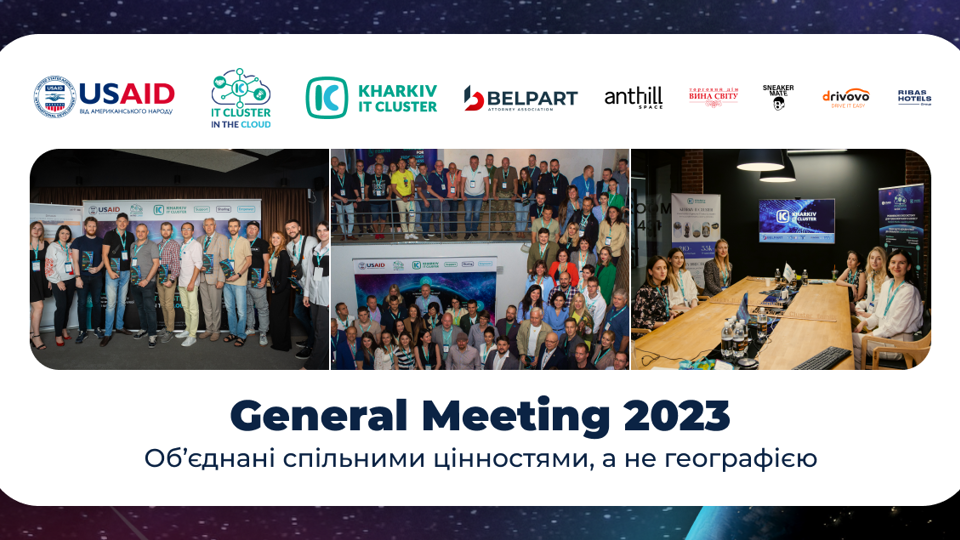 08 вересня 2023 року команда та учасники Харківського ІТ Кластеру зустрілися на Загальних Зборах 2023 водночас у Харкові, Києві, Львові та в онлайні. На зустрічі підбили підсумки першого півріччя 2023 року та обговорили найближчі плани.