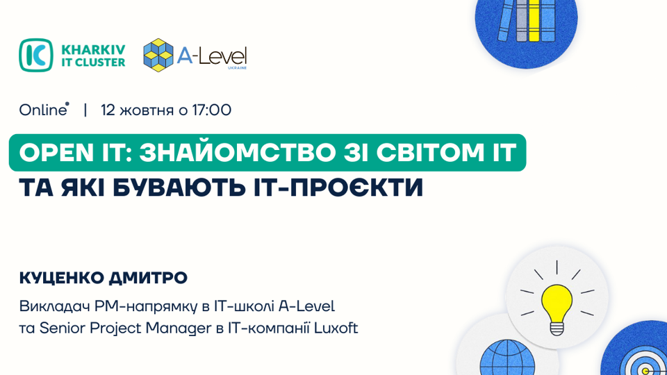Розвиток IT-світу не стоїть на місці, тож щоб розповісти про нього, Kharkiv IT Cluster запускає новий сезон проєкту Open IT. «Знайомство зі світом IT та які бувають IT-проєкти»‎ — саме з цією темою нам допоможе розібратися Дмитро Куценко, викладач PM-напрямку в IT-школі A-Level та Senior Project Manager в IT-компанії Luxoft. 12 жовтня о 17:00 на вебінарі будуть порушені такі теми: ❓ які IT-проєкти бувають та їхні особливості; ❓ які види вітчизняних IT-компаній; ❓ хто працює в IT; ❓ чому IT — це перспективно. Коли: 12 жовтня о 17:00 Формат: онлайн, Zoom/YouTube Реєстрація