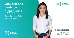 Читати повністю20 квітня пройшла зустріч Legal Talk із Q&A-сесією для мемберів Kharkiv IT Cluster! Спікеркою зустрічі виступила одна з найкращих ІТ-юристок України та Head of Legal Khar...