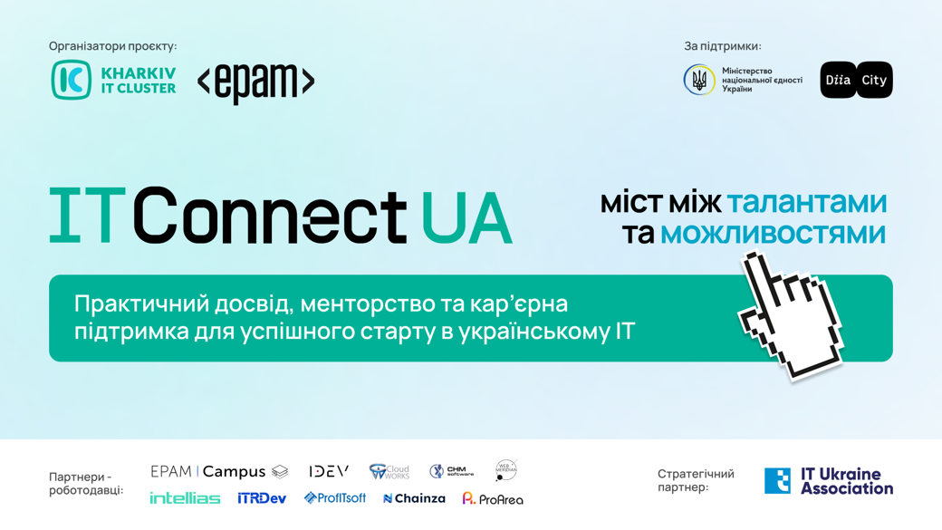 IT Connect UA — це освітній та кар’єрний проєкт за лідерства Kharkiv IT Cluster, який допомагає українцям в Україні та по всьому світу розпочати кар’єру в українському IT. Проєкт складається з кількох ступенів навчання, менторської підтримки від провідних ІТ-компаній та кар’єрних консультацій, щоб допомогти початківцям зробити перший крок у технологічній індустрії України.