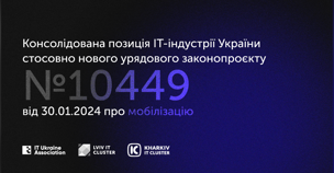 Читати повністюАсоціація IT Ukraine, Kharkiv IT Cluster та Lviv IT Cluster висловлюють консолідовану позицію ІТ-індустрії стосовно нового урядового законопроєкту №10449 від 30.01.2024 про мобі...