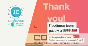 Читати повністюKharkiv IT Cluster разом із компанією CodeIT провели воркшоп на тему Scrum & Kanban для закритого ком’юніті Junior Club. 🔥З нами спілкувався Валерій Борзов, Delivery Manag...