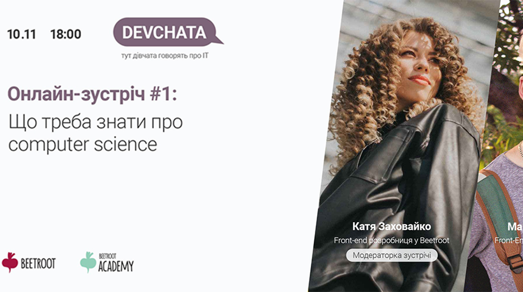 The first guest will be Marina Skrypnyk, Front-End developer Beetroot. Marina is from Beetroot Solutions team, which develops turnkey projects. Worked with Ember.js and Angular frameworks, now the basis of its stack - Vue.js and React. She also studies software architecture. Worked on the international adaptation of the front-end course in the framework of cooperation between Beetroot Academy and Pink Programming (educational platform for girls in Sweden), taught modules in Pink Programming with JavaScript and Vue.js. Katya will ask Marina what she needs to know about computer science. And you join the conversation too!How is everything arranged?