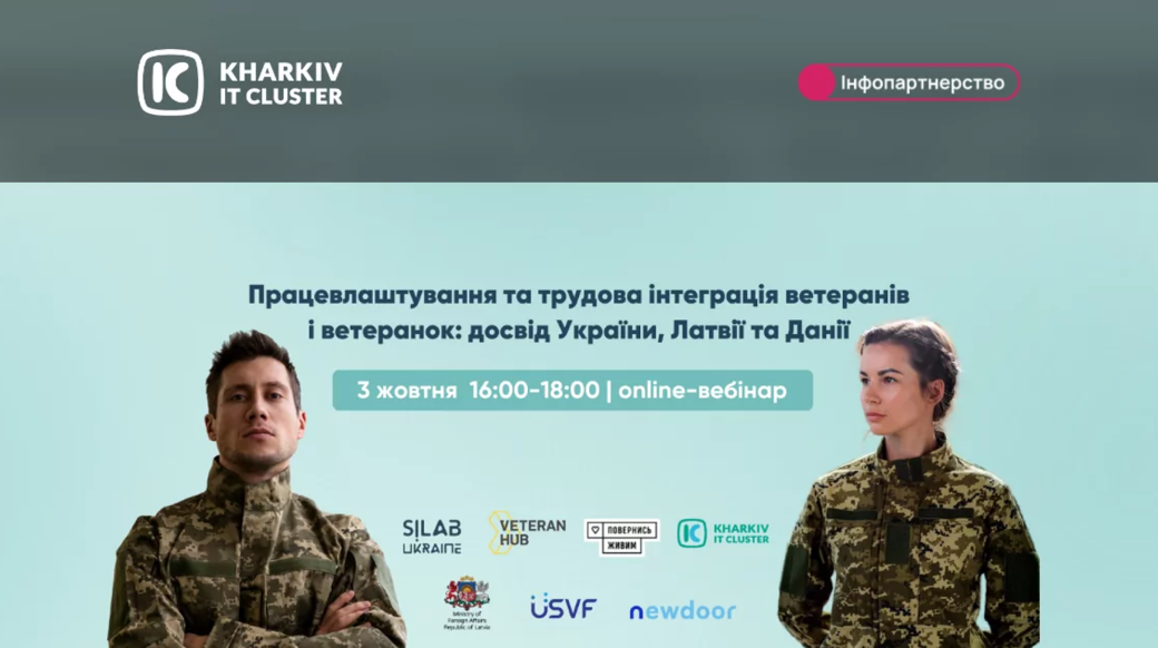 3 жовтня відбудеться відкритий вебінар «Працевлаштування та трудова інтеграція ветеранів і ветеранок: досвід України, Латвії та Данії». Захід присвячений темі працевлаштування військових, їхньої реінтеграції у професійне середовище та розвитку ветеранських програм на робочих місцях.