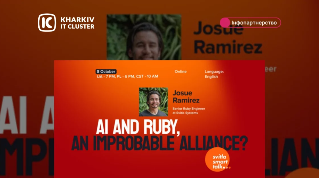 Date - 8 October Time - Ukraine - 7:00 PM, Poland - 6:00 PM, Mexico - 10:00 AM, Costa Rica - 10:00 AM, Argentina - 1 PM. Duration - 1.5 hours (60 min. speech + 30 min. Q&A) Language - English All other details will be sent after registration. Registration is free and mandatory.Svitla Smart Talk: AI and Ruby, an Improbable Alliance?