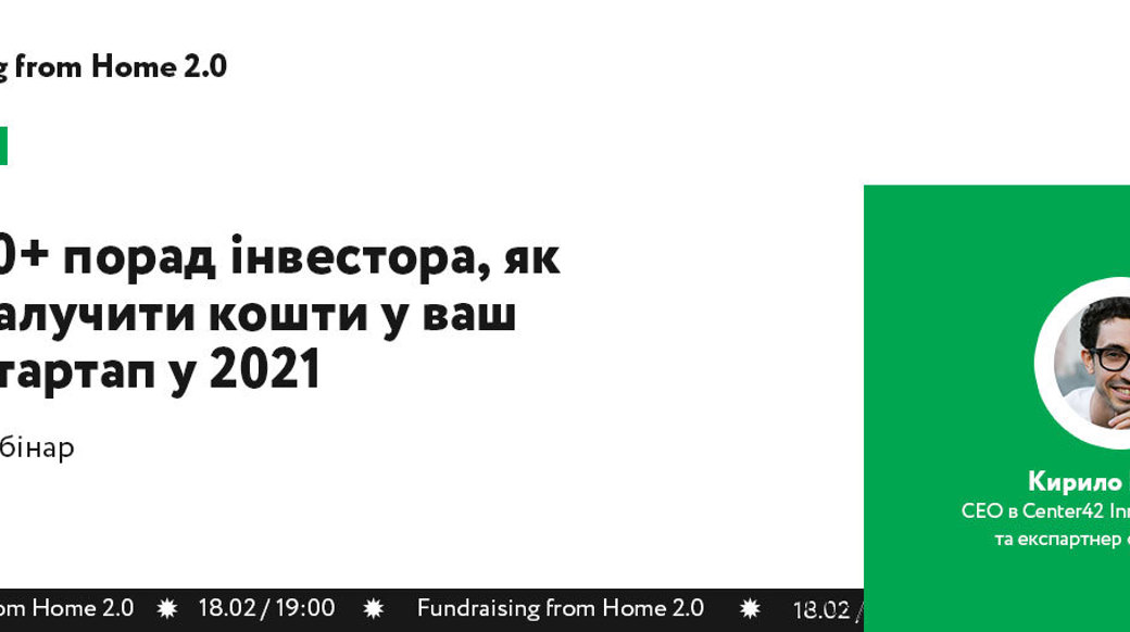 Кирило Мазур, CEO в Center42 Innovation Agency та експартнер фонду IG.VC з досвідом $11 млн інвестицій у 40+ стартапів. За свої 10 років в стартап-індустрії та 5 років інвестицій Кирило проаналізував більше 10 000 стартапів та має що розповісти про фандрайзинг з боку інвестора. Участь у воркшопі безкоштовна. Для всіх зареєстрованих учасників – знижка 15% на повний курс Fundraising From Home 2.0, що стартує 10 березня. Коли: 18.02, 19:00-20:00. Де: Zoom(за годину до заходу ми надішлемо лист із доступом до вебінару)10+ порад інвестора, як залучити кошти у ваш стартап у 2021