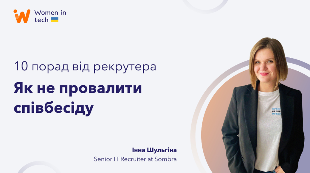 Запрошуємо вас на захопливий вебінар на тему "10 порад, як не провалити співбесіду", який проведе Інна Шульгіна, Senior Recruiter у компанії Sombra для проєкта Women in Tech Ukraine.