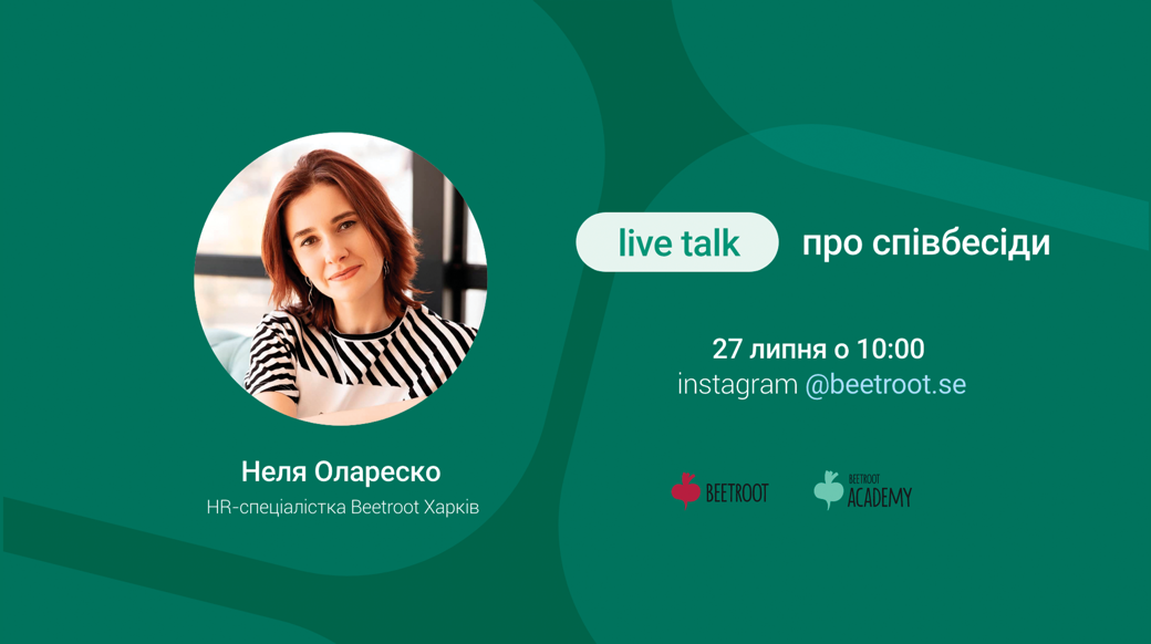 Приєднуйтесь до лайву на сторінці @beetroot.se в Instagram ↘️ Live Talk про співбесіди ↙️ з Нелею Олареско, HR-спеціалісткою з Beetroot Харків, буде про таке:- Як підготуватись до HR інтерв'ю, якщо воно проходитиме онлайн або офлайн?