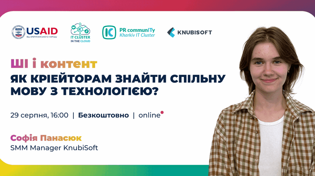 Крім того, спікерка івенту розкаже про власний досвід і лайфхаки у роботі з ШІ, які ви одразу зможете використовувати на практиці. 👤 Спікерка івенту: Софія Панасюк, SMM Manager KnubiSoft, доведе, що не тільки ChatGPT може бути корисним. Івент універсальний і буде корисним як для початківців, так і для досвідчених креативників. Реєструйтесь за посиланням — додайте новий інструмент у свій арсенал і прокачайте себе як фахівця 💪 Зустріч в рамках мітапу PR CommuniTy реалізується Kharkiv IT Cluster за підтримки Програми USAID «Конкурентоспроможна економіка України».🌐 Facebook USAID CEP 🌐 Instagram USAID CEP 🌐 LinkedIn USAID CEP 🌐 Twitter USAID CEP
