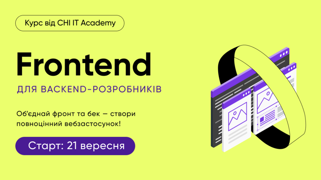 👉 Розуміння принципів і практик фронтенд-розробки: ти навчишся проєктувати й створювати вебзастосунок. 👉 Досвід створення повноцінного застосунку: ти зможеш інтегрувати фронтенд і бекенд, створювати динамічні вебсторінки та обробляти користувацькі дані. 👉 Знання основ взаємодії між фронтендом і бекендом: ти опануєш впевненість у тому, як дані передаються між клієнтом і сервером, і навчишся ефективно використовувати ці знання під час створення власних майбутніх проєктів. 👉 Портфоліо: на виході у тебе буде готовий застосунок, який можна продемонструвати потенційним роботодавцям або клієнтам. Курс стартує вже 21 вересня, тому переходь за посиланням, дізнавайся деталі й реєструйся, щоб кар’єрні мрії перетворилися в конкретні дії! До зустрічі на навчанні! 😉Курс Frontend for Backend Developer від CHI IT Academy