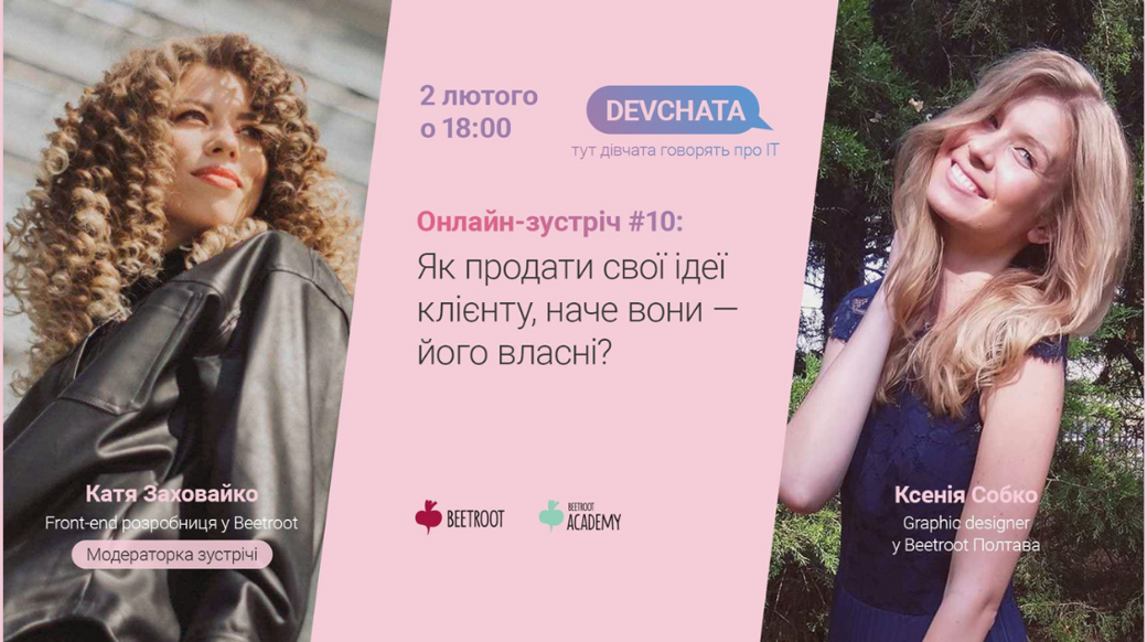 Ксенія Собко, експертка цієї зустрічі, з темою «твоє бачення vs бриф від клієнта» знайома не з чуток. Ксенія працює графічним дизайнером у Beetroot Полтава. Архітектор за освітою, вона останні 6 років займається графічним дизайном, Web-, 3D-моделюванням та анімацією. Модеруватиме зустріч Катя Заховайко — співавторка проєкту DEVCHATA, front-end розробниця у Beetroot, викладачка у Beetroot Academy та засновниця Happy project (happyproject.com.ua) – проєкту, метою якого є робити людей щасливішими, даючи їм знання про саморозвиток, мотивацію, позитивну психологію. Ці зустрічі — це жваві розмови (а не сухі «ефіри»), де Катя постійно слідкує за коментарями та питаннями, адже для нас дійсно важливо почути та обговорити різні думки.