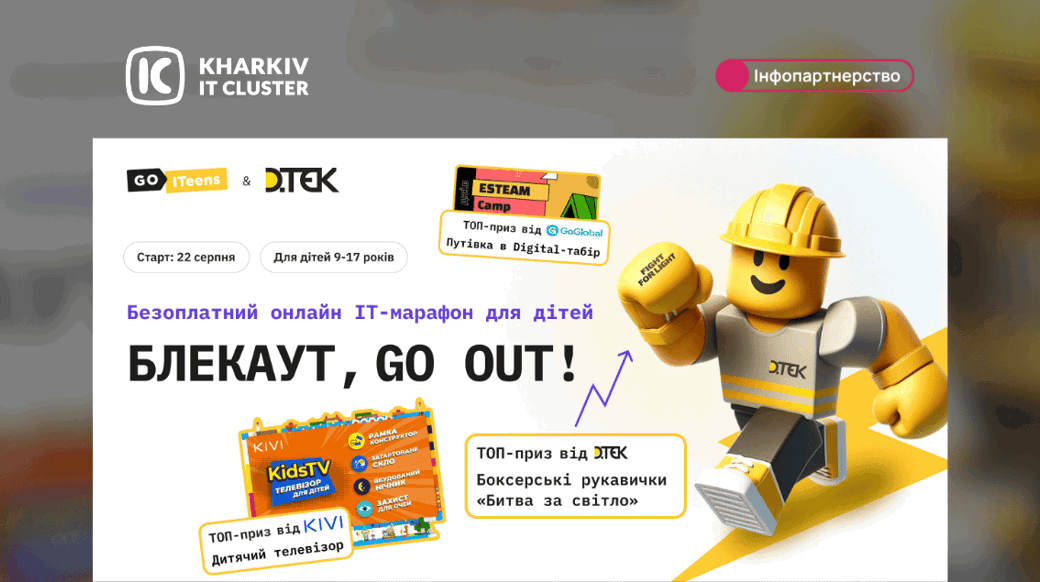👉 3 телевізори від KIVI — KIDS TV з рамкою конструктором, загартованим склом, вбудованим нічником та захистом для очей 😍 👉 1 путівку в digital-табір від GoGlobal. 👉 5 боксерських рукавичок «Битва за світло» від ДТЕК. 👉 А також сотні інших призів від ДТЕК, Robota.ua та Видавництва Ранок. Реєструйтеся, стартуйте марафон та долучайтеся до розіграшу призів!Безоплатний ІТ-марафон від GoITeens і ДТЕК «Блекаут, GO OUT!»
