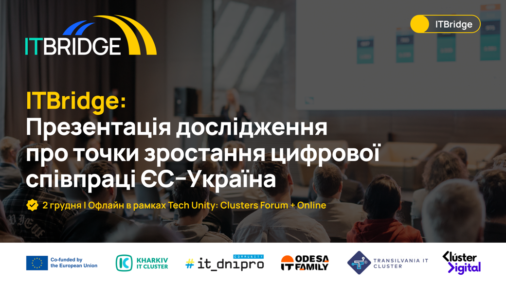 Щоб показати, у яких саме сегментах це партнерство може бути масштабоване, Kharkiv IT Cluster у межах стратегічної ініціативи ITBridge, у співпраці з партнерами Transilvania IT Cluster, Cluster Digital de Catalunya, IT Dnipro Community та Odesa IT Family, презентує аналітичний звіт EU–Ukraine Digital Sector Interlinkages Report. Запрошуємо долучитися до події.
