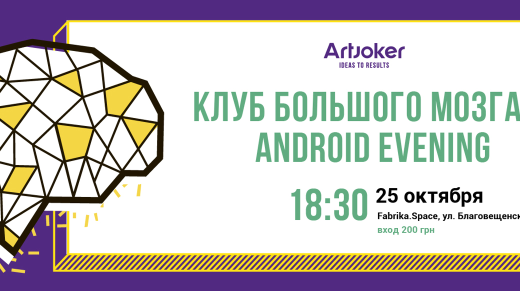 25 жовтня в FABRIKA.SPACE команда Artjoker втретє збере топових програмістів для того, щоб прокачати скіли і обмінятися досвідом. Тема третього “Клуба Большого Мозга” - Android-розробка. Будемо говорити про інструменти, кросплатформеність і перспективи. Початок о 18:30. “Клуб Большого Мозга” - це потужний нетворкінг і інтерактивні лекції, в яких немає води. Наші спікери - це передові практики в своїй області. Наша мета - створити сильну спільноту всіх, хто захоплений розробкою. Кому буде цікаво: Android-девелоперам різних рівнів і тим, хто знає, що mobile захопив світ і хоче бути на хвилі. Хто буде виступати: Антон Мінашкін (Chief Software Engineer в EPAM Systems) Тема: Performance: How to build an app instead of slideshow Михайло Анохін (Android Developer в Dev-Pro) Тема: Productivity Hero. Know Your Tools Микола Лотоцький (Technology Expert at Dev-Pro.net) Тема: Мобільна розробка. Між Сциллою і Харибдою. Native, hybrid or cross platform. Що вибрати? Організаційний внесок: 200 грн Реєстрація та подробиціКлуб Большого Мозга: Android Evening