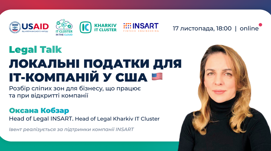 🎙 Оксана Кобзар, Head of Legal INSART. Head of Legal Kharkiv IT Cluster 👉 Ваш безкоштовний квиток за цим посиланням після реєстраціїЛокальні податки для ІТ компаній у США: Розбір сліпих зон для бізнесу, що працює та при відкритті IT-компанії
