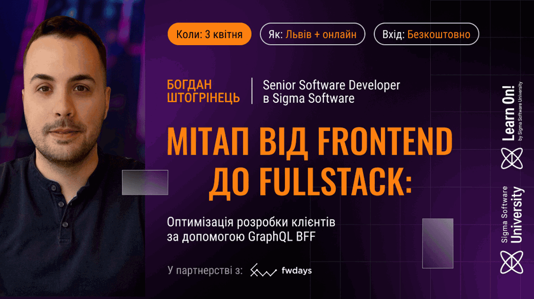 🔥 Доєднуйтесь до безкоштовного мітапу від Frontend до Fullstack: організація розробки клієнтів за допомогою GraphQL BFF від Sigma Software University та Fwdays!