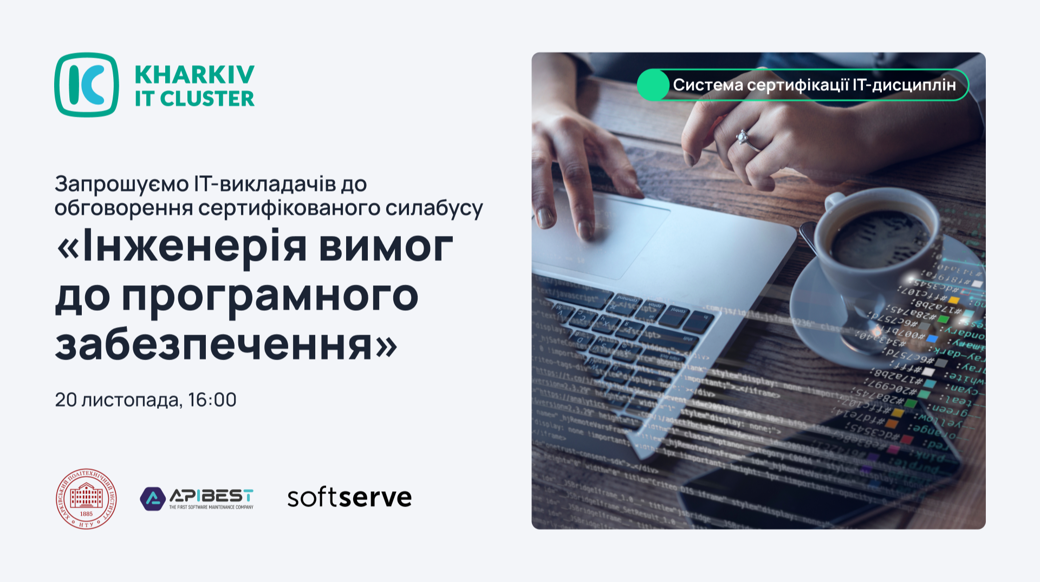 Харківський ІТ Кластер запрошує ІТ-викладачів закладів освіти та всіх охочих до обговорення рецензованого силабусу дисципліни «Інженерія вимог до програмного забезпечення» у межах проєкту «Система сертифікації ІТ-дисциплін».